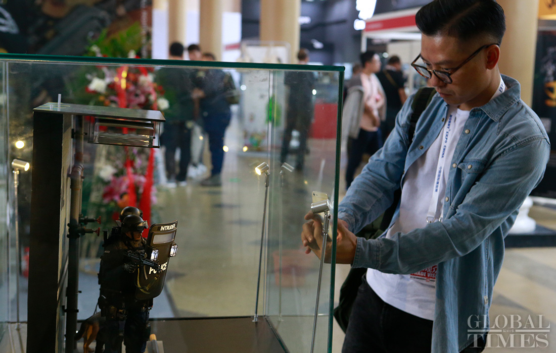 A visitor takes a photo of an exhibit with a model police officer. Photo: Li Hao/GT figcaption >