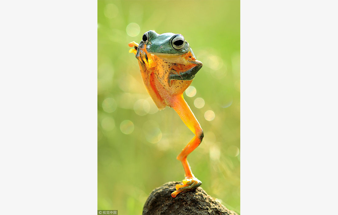 A Wallace’s flying frog appears to pull a kung fu pose as it stands on one leg on a rock in Jombang, Indonesia on April 11, 2017. Photo: VCG