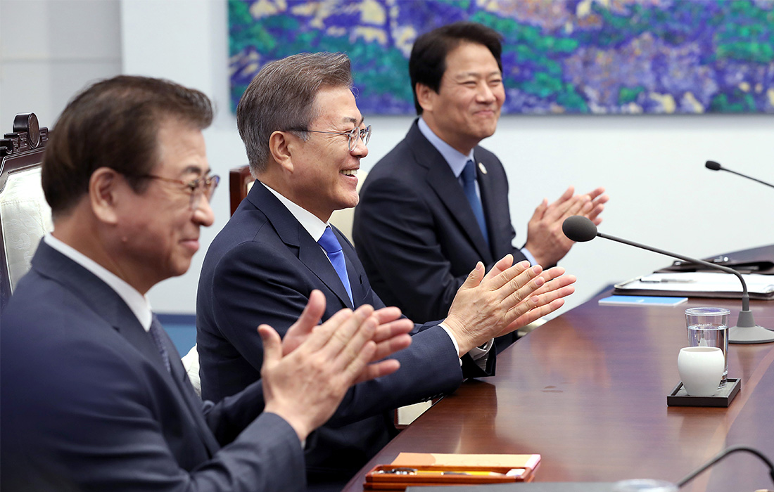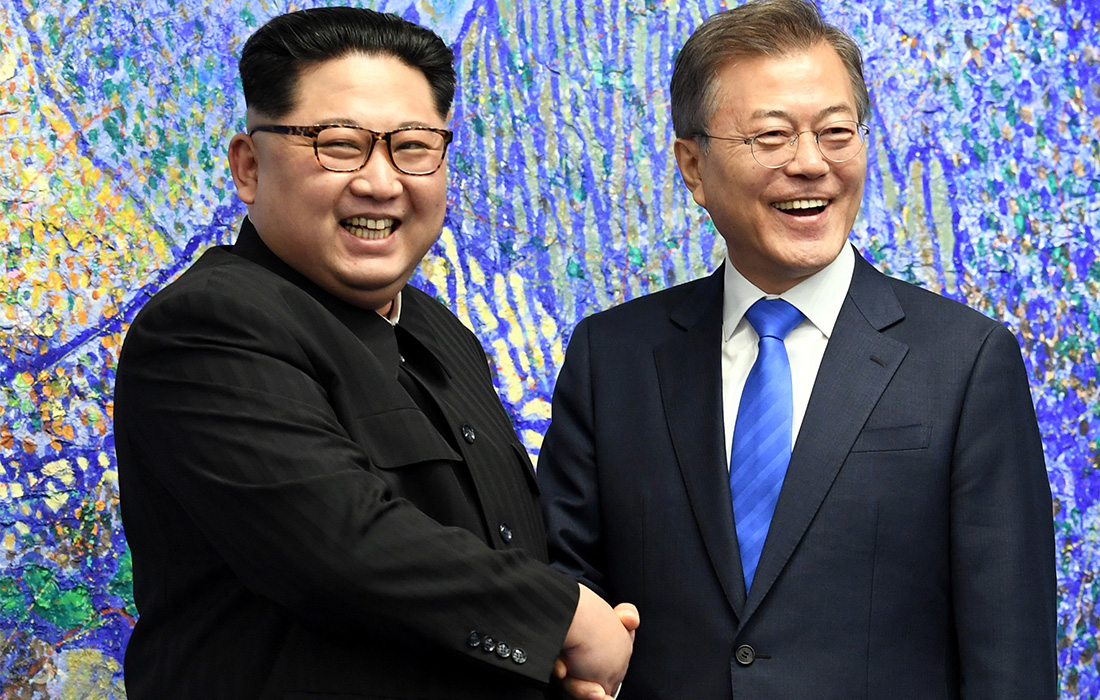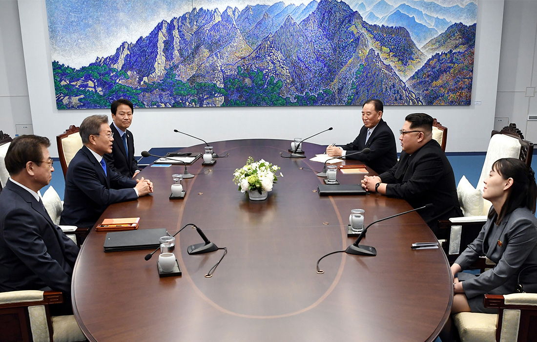 South Korean President Moon Jae-in and DPRK’s leader Kim Jong-un begin formal talks Friday in the Peace House of Panmunjom during the third-ever inter-Korean summit. Photo: Courtesy of 2018 Inter-Korean Summit Preparation Committee figcaption >