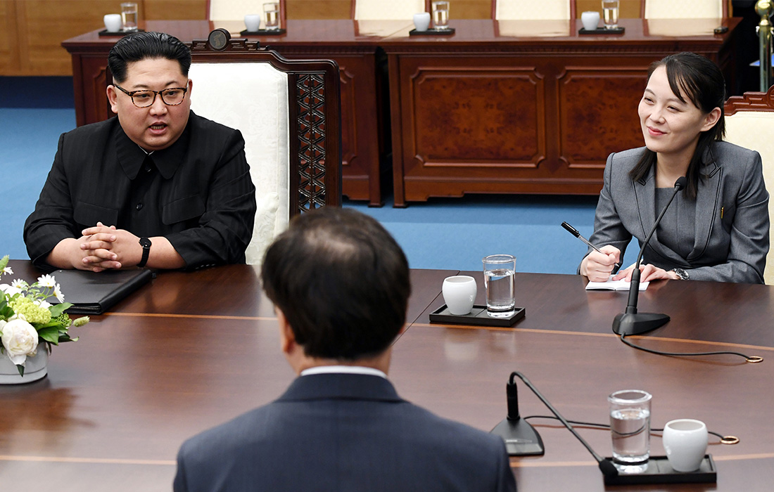 North Korean leader Kim Jong-un and his younger sister Kim Yo-jong at the third-ever inter-Korean summit Friday in the Peace House of Panmunjom. Photo: Courtesy of 2018 Inter-Korean Summit Preparation Committee figcaption >