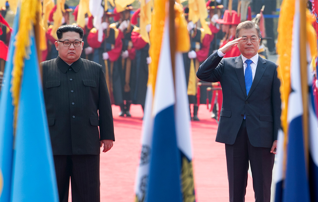 The two leaders inspect the South Korean honor guard. This is the first time a North Korean leader has reviewed the South’s honor guard. Photo: Courtesy of 2018 Inter-Korean Summit Preparation Committee figcaption >