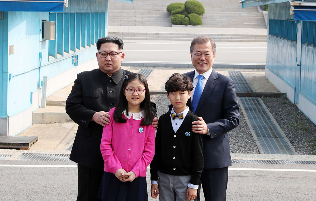 The leaders of South Korea and North Korea pose for photos with two children who presented them with flowers. Photo: Courtesy of 2018 Inter-Korean Summit Preparation Committee figcaption >
