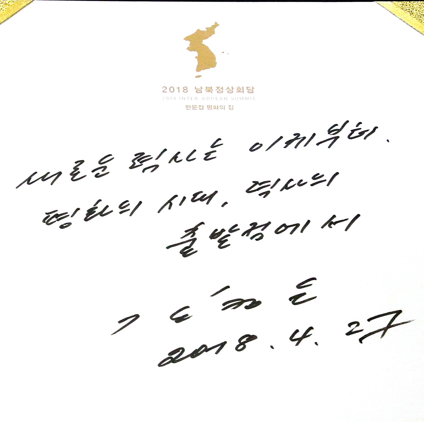 Kim Jong-un’s written note in the guestbook reads: “A new history begins now – at the starting point of history and the era of peace.” Photo: Courtesy of 2018 Inter-Korean Summit Preparation Committee figcaption >