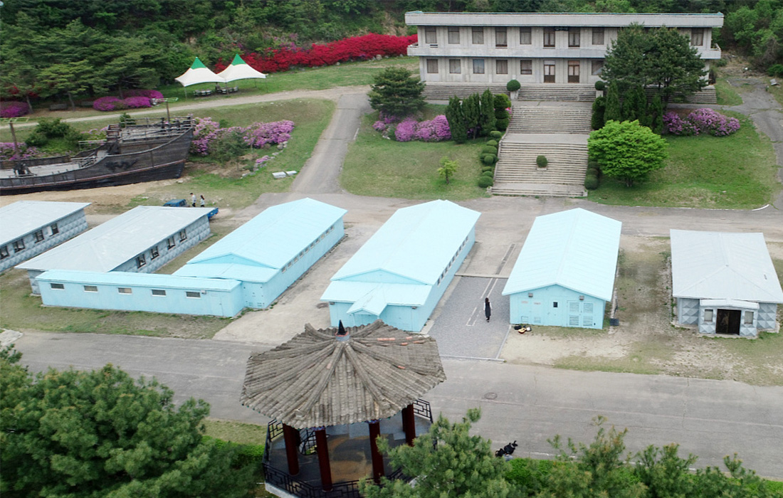 An aerial view of a tourist attraction that imitates Panmunjom, the border village between the two Koreas, where the inter-Korean summit took place. Photo: VCG figcaption >