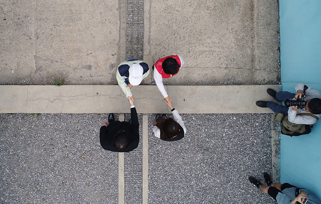 Visitors recreate the moment Moon and Kim shook hands on the military demarcation line inside Panmunjom during the inter-Korean summit at a tourist attraction in Namyangju, South Korea, which mimics Panmunjom. Photo: VCG figcaption >