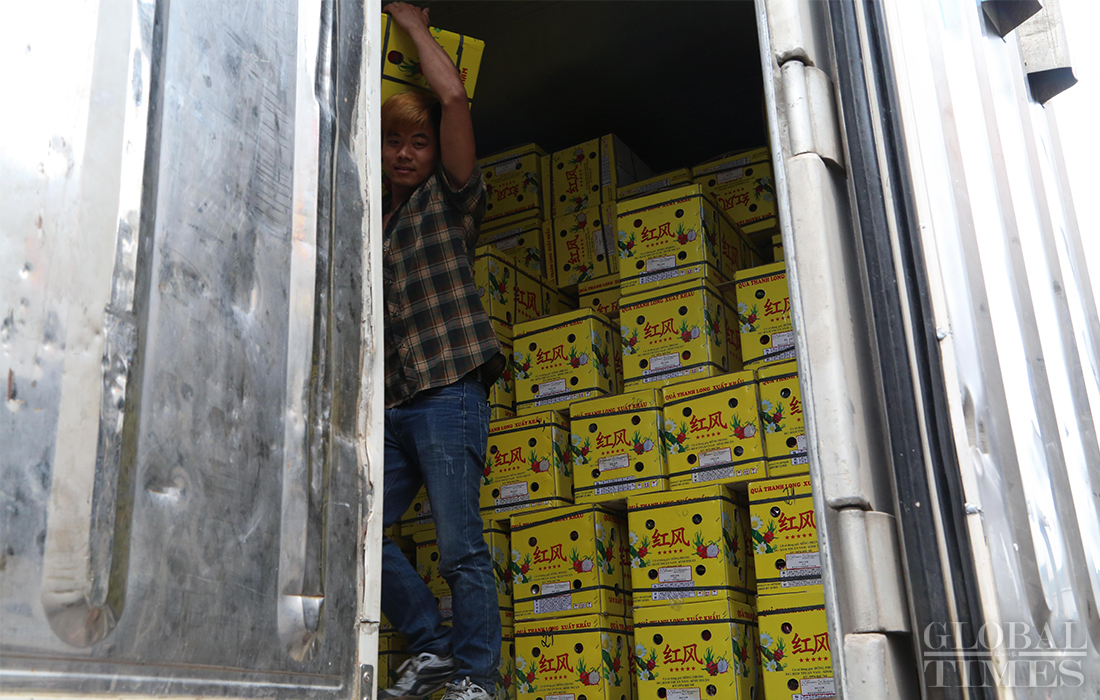 A Vietnamese worker runs to the front of a truck after loading it with goods to transport. Photo: Chen Qingqing/GT figcaption >