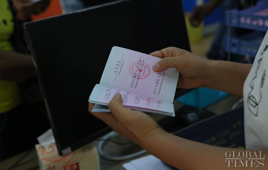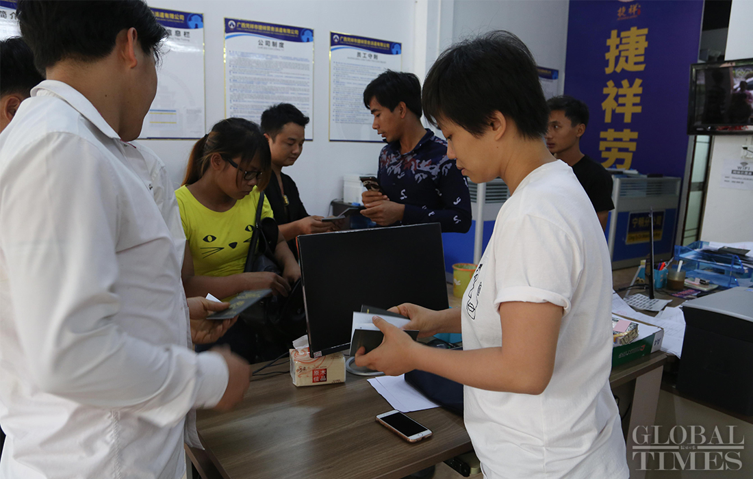 An employee helps Vietnamese workers check their passports to make sure everything is in order. Photo: Chen Qingqing/GT figcaption >
