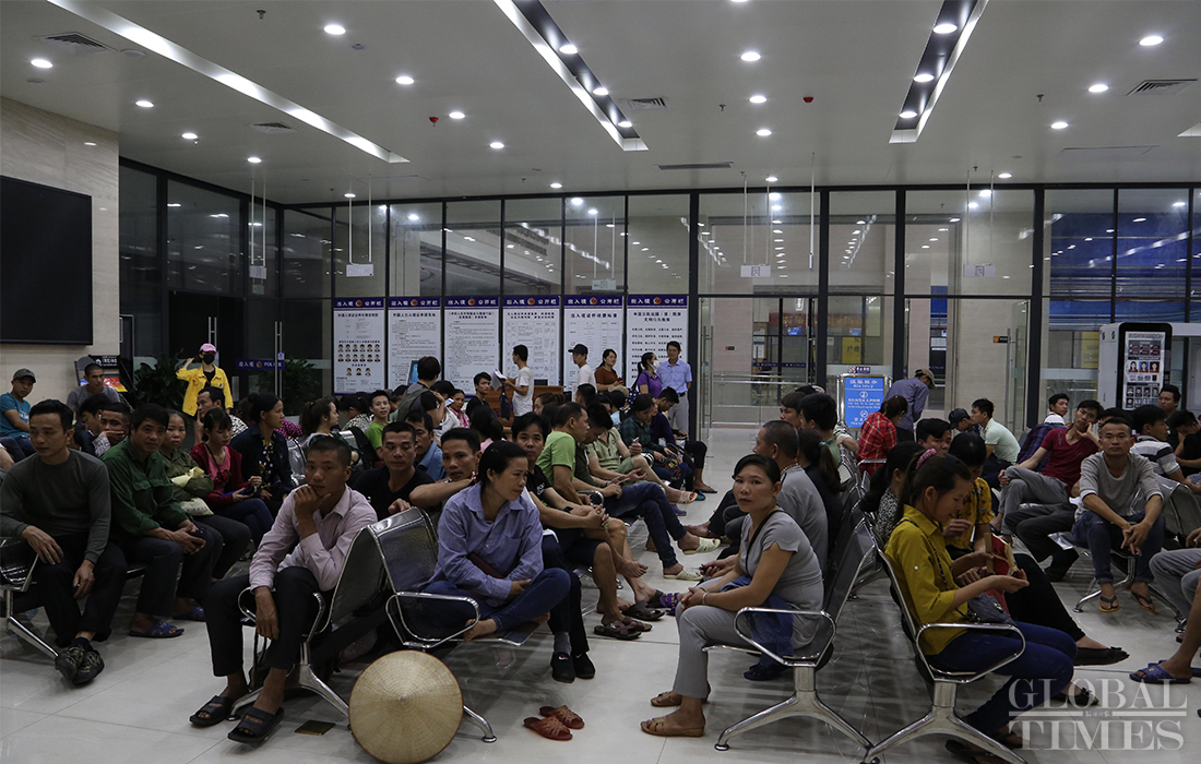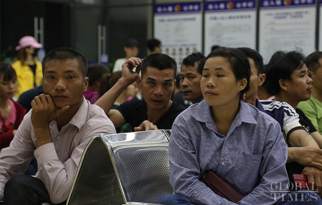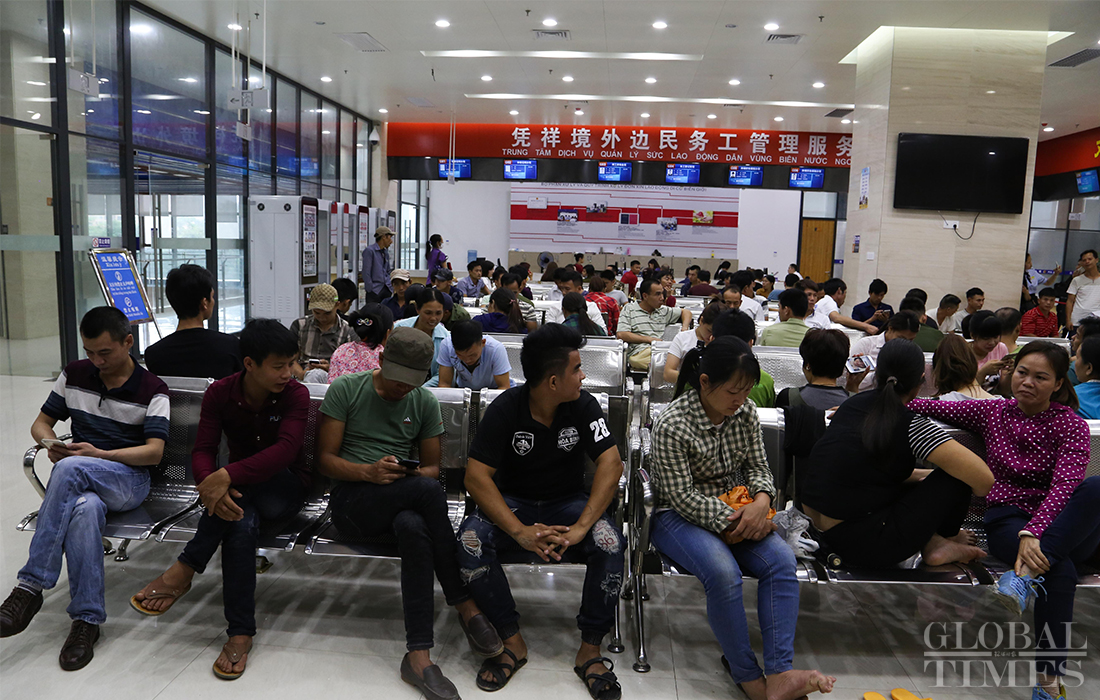 Vietnamese workers wait to go through the proper channels at the Pingxiang Overseas Border Workforce Management and Service Center in Pingxiang, Guangxi Zhuang Autonomous Region. The center receives about 500 Vietnamese workers on average every day to fill a variety of jobs in the border town. The highest volume of workers reached 5,000 per day after this year’s Chinese New Year. Photo: Chen Qingqing/GT figcaption >