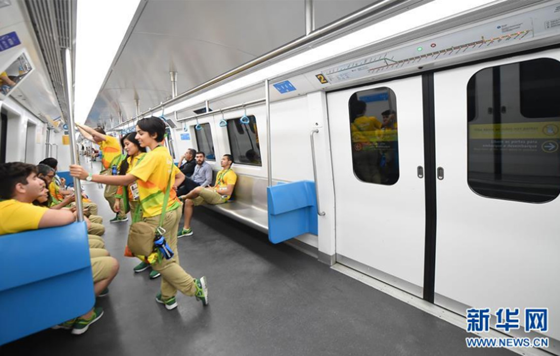 Olympic volunteers take the subway line 4 in Rio de Janeiro, Brazil, on August 1, 2016. Subway trains on this line are all manufactured by China. (Photo: Xinhua) figcaption >