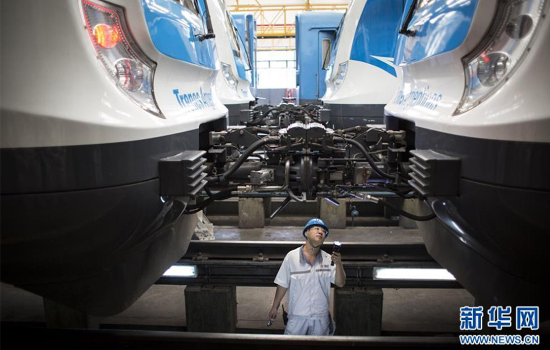A Chinese technical employee checks the train that will run on the Roca Line intercity railway in Llavallol, a city south of the capital city Buenos Aires, Argentina, on April 11, 2017. In recent years, various types of locomotives, EMU trains, passenger trains, freight trains and subway trains made by China have been delivered to Argentina. (Photo: Xinhua) figcaption >