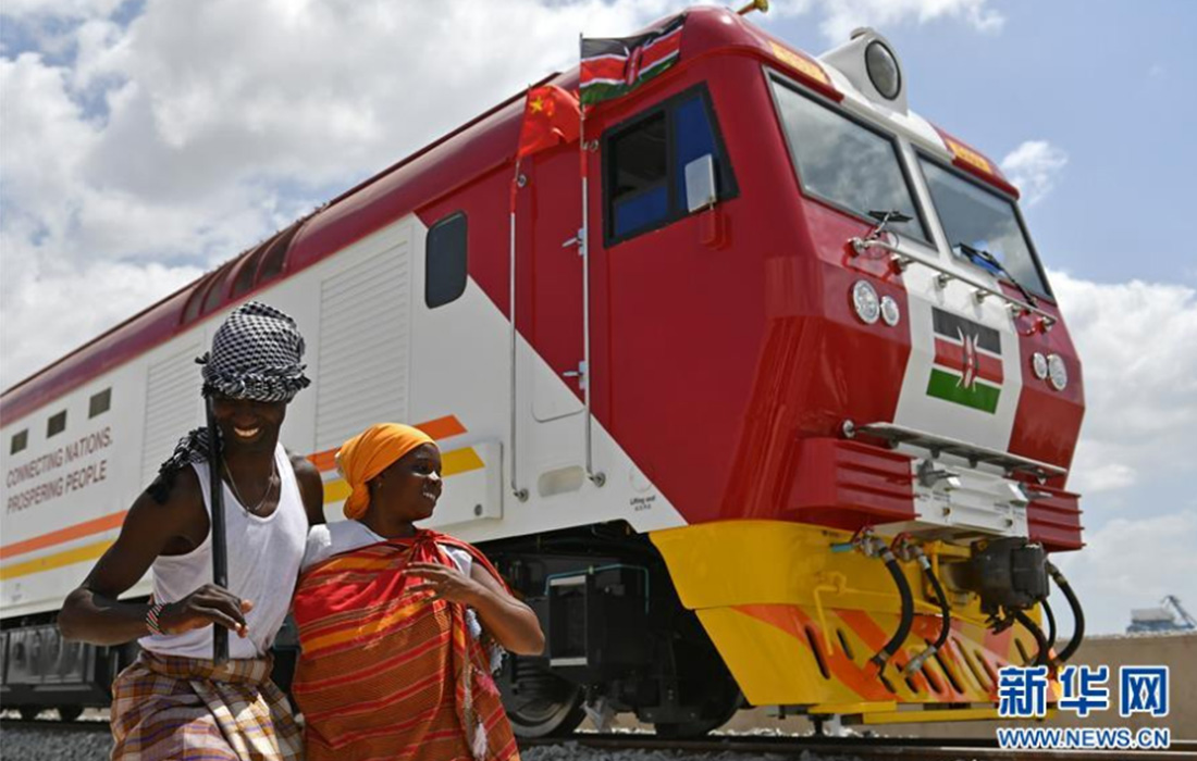 Local people dance and sing beside the first batch of diesel locomotives on the Mombasa-Nairobi Railway in Kenya. Constructed by a Chinese enterprise, the Mombasa-Nairobi Railway connects the eastern port in Mombasa to Kenya’s capital city Nairobi in the west. It stretches about 480 kilometers and was opened to traffic on May 31, 2017. (Photo: Xinhua) figcaption >