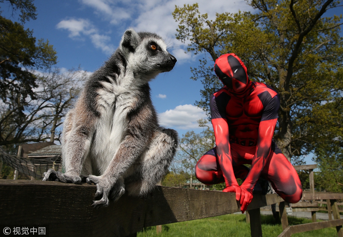 Luke Aquilina as Deadpool demonstrates his parkour skills by balancing on a fence with a lemur at the Blair Drummond Safari Park in Scotland. The parkour enthusiasts demonstrated their skills around the safari park as it prepares for a superhero weekend on May 26 and 27. Photo: VCG figcaption >
