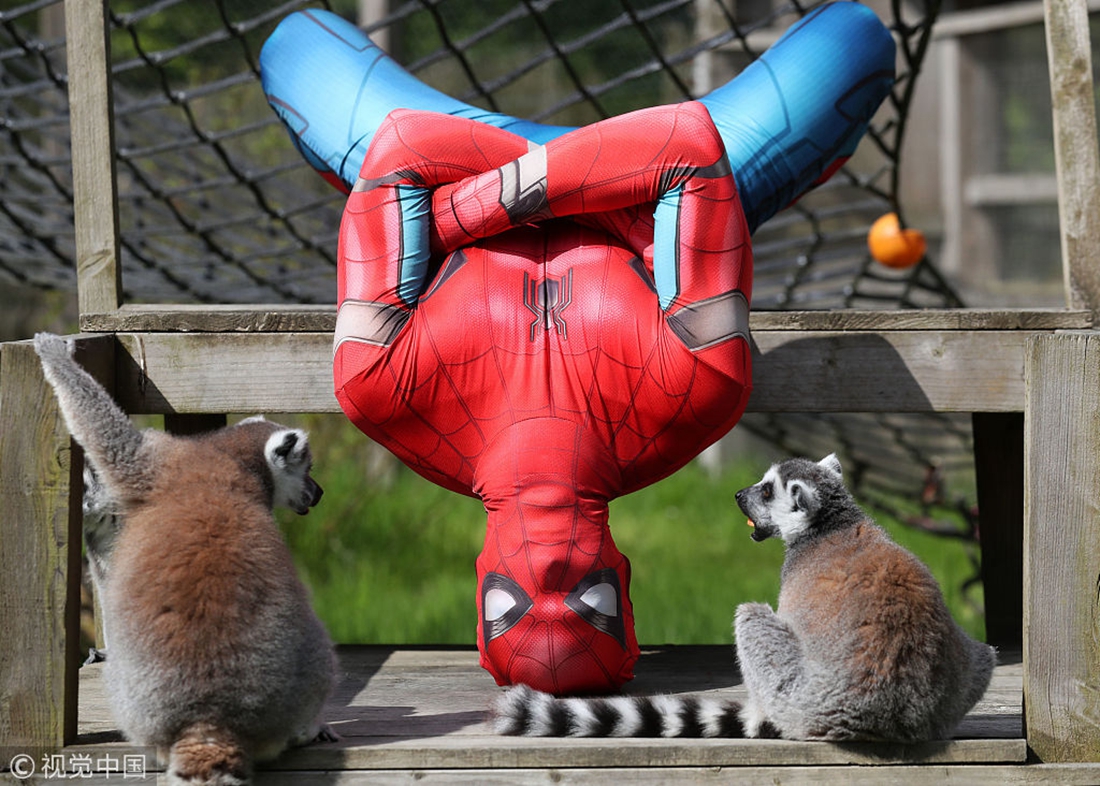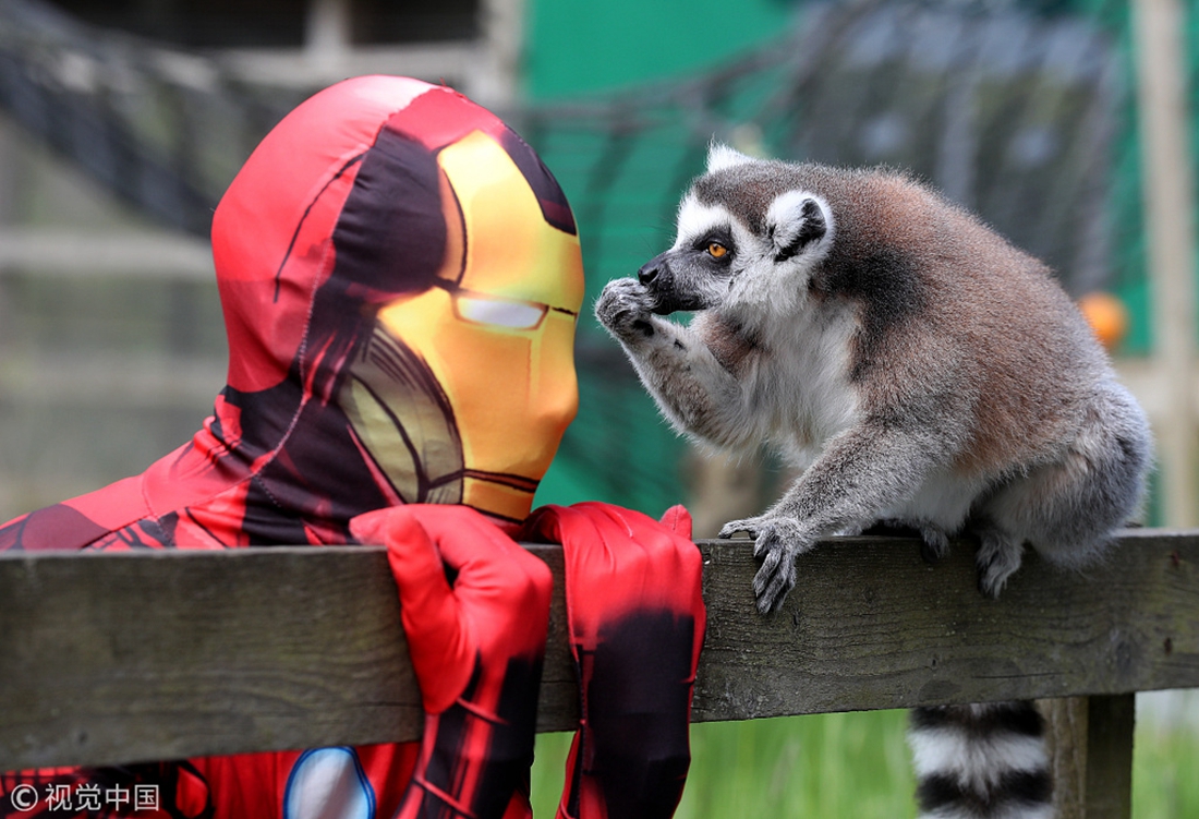 Chris Martin as Iron Man interacts with a lemur at the Blair Drummond Safari Park in Scotland. The parkour enthusiasts demonstrated their skills around the safari park as it prepares for a superhero weekend on May 26 and 27. Photo: VCG figcaption >