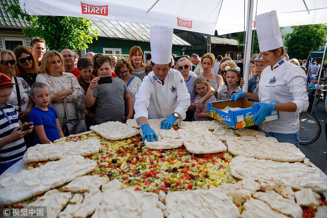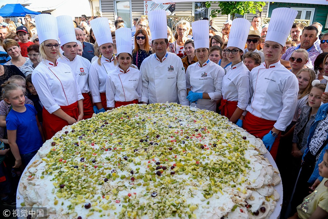 Hotel Sulbin’s chef Marek Rybacki and his gastronomy students attempted to break a Polish record by making the biggest meringue cake during the 5th Garwolin Festival of Tradition and Culture in Garwolin, Poland, on May 20, 2018. According to Rybacki, his record meringue, layered with fruit, has a diameter of 2 meters and a target weight of about 200kg. The cake included various ingredients like 127kg of fruit, 100kg of cheese and 22 liters of sour cream. Photos: Omar Marques/Anadolu Agency/Getty Images/VCG