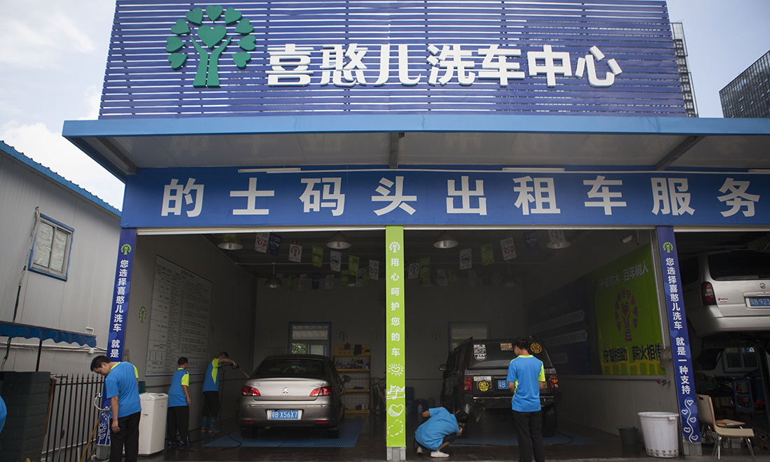 Xihan’er Car Wash has seen brisk business since opening its doors near Meilin subway station on August 8, thanks to the hard work of its eight employees, all of whom are diagnosed with mental disabilities.