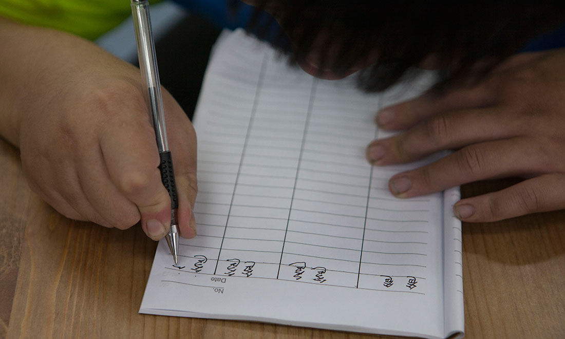 Chen Xingyou writes the Chinese characters “Baba”, or “Dad,” in the car wash’s lounge on July 30. In addition to their work, the employees attend classes in writing, reading and other skills. On busy days, the employees are split into shifts that rotate between class and car washing every half hour. figcaption >