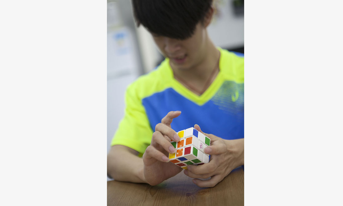Employee Dong Wei works to solve a Rubik’s cube on July 30. It normally takes Dong only several minutes to solve the puzzle. figcaption >