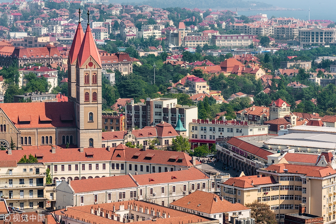 An aerial view shows the colorful German architecture in Qingdao’s old town on May 16, 2017. Photo: VCG figcaption >