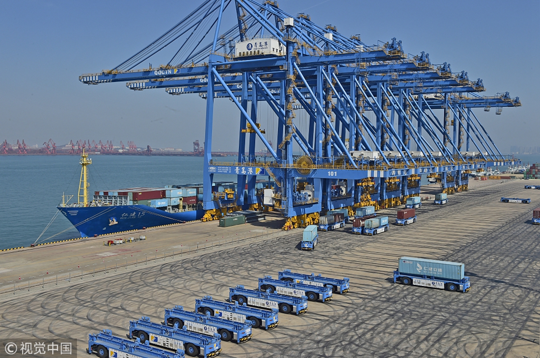 The automated container terminal stands ready to receive ships at the Port of Qingdao, East China's Shandong Province, on March 15, 2017. Photo: VCG figcaption >