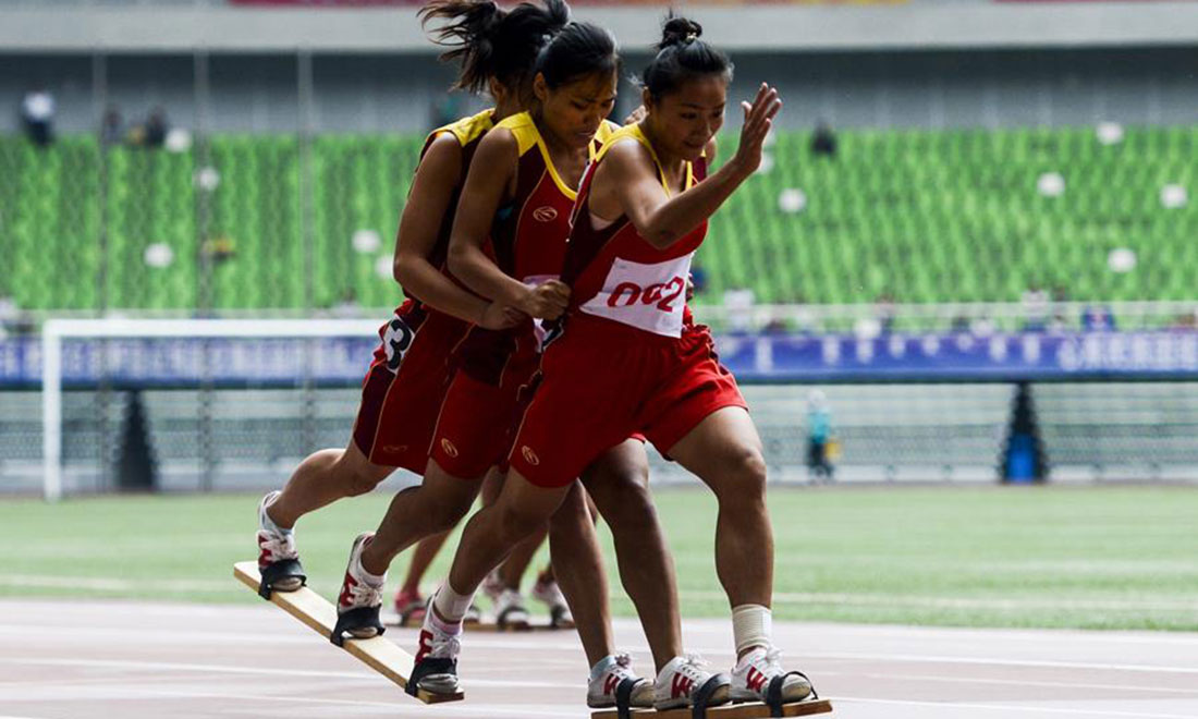 Lin Lifei (right) runs with her teammates from the Guangxi delegation in the 2x100-meters broad-shoe relay race on August 11, 2015. The event was included in the games in 2007. figcaption >