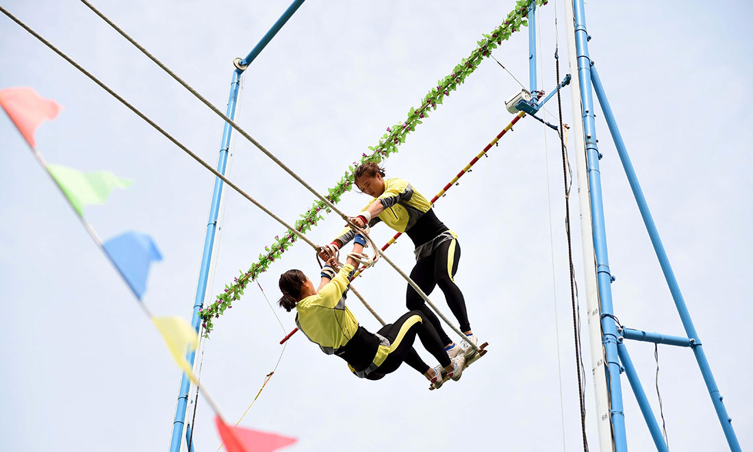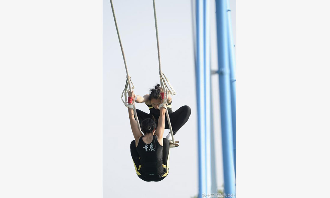 Wang Xiaoying (right) and Ma Qijin from the Chongqing delegation compete in the 55kg-class swing event on August 12, 2015. The team won the first place in the height category. The swing completion is open only to female athletes. figcaption >