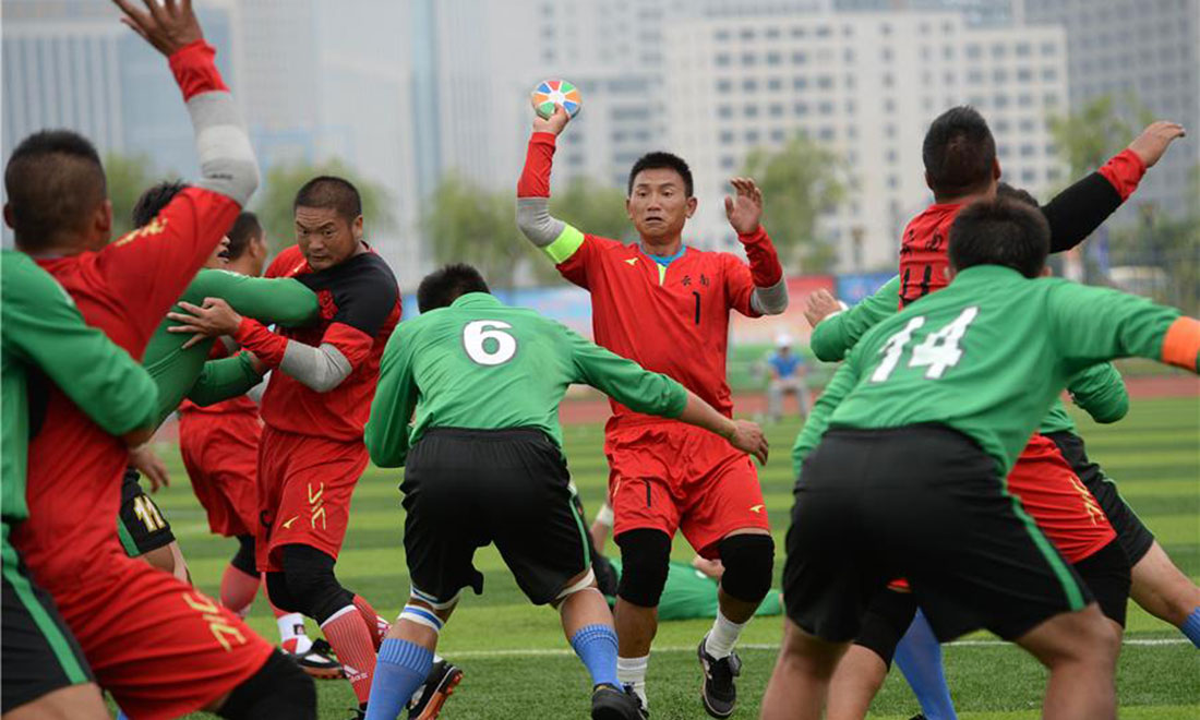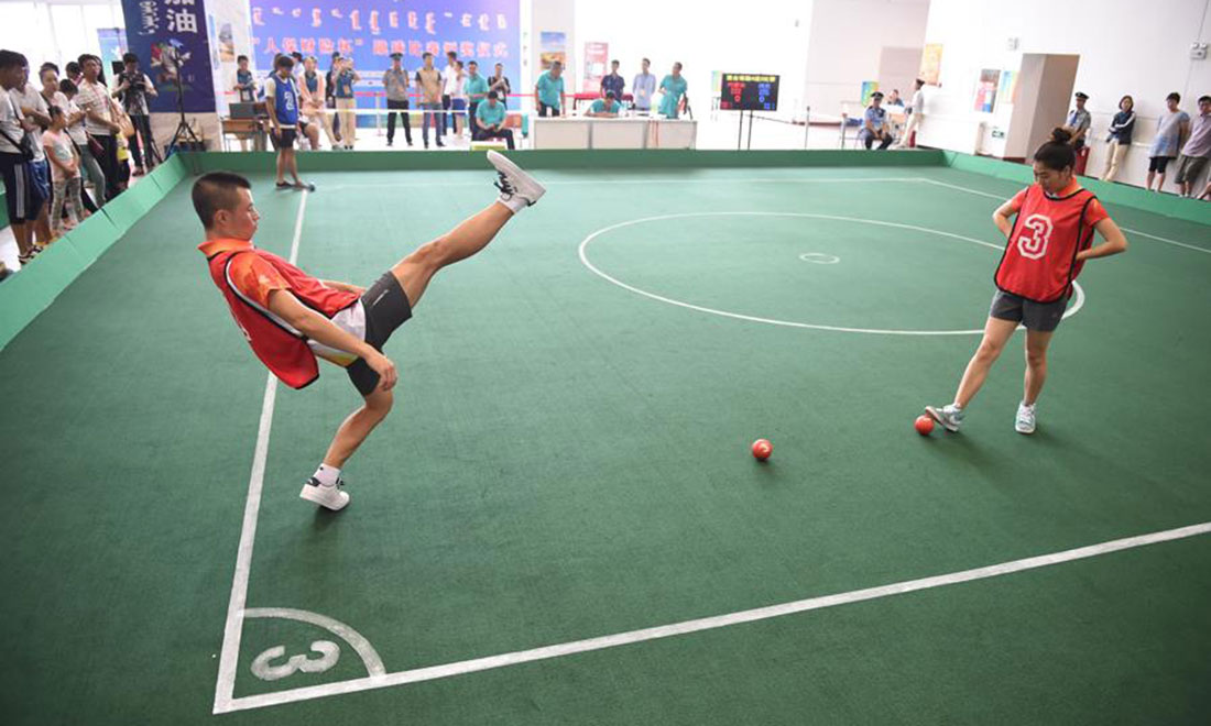 Han Liangliang (left) and Bao Xuezhen from the Inner Mongolia delegation warm up before the cuqiu mixed doubles final on August 11, 2015. Cuqiu is an ancient ball game dating back to the Warring States Period (475 BC–221BC). Cuqiu is popular among the Manchu, Mongolian and Hui ethnic groups, and was listed as a competition event in 1999. figcaption >