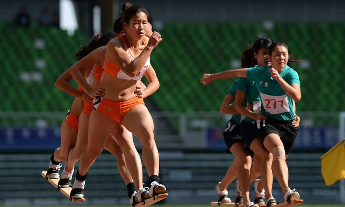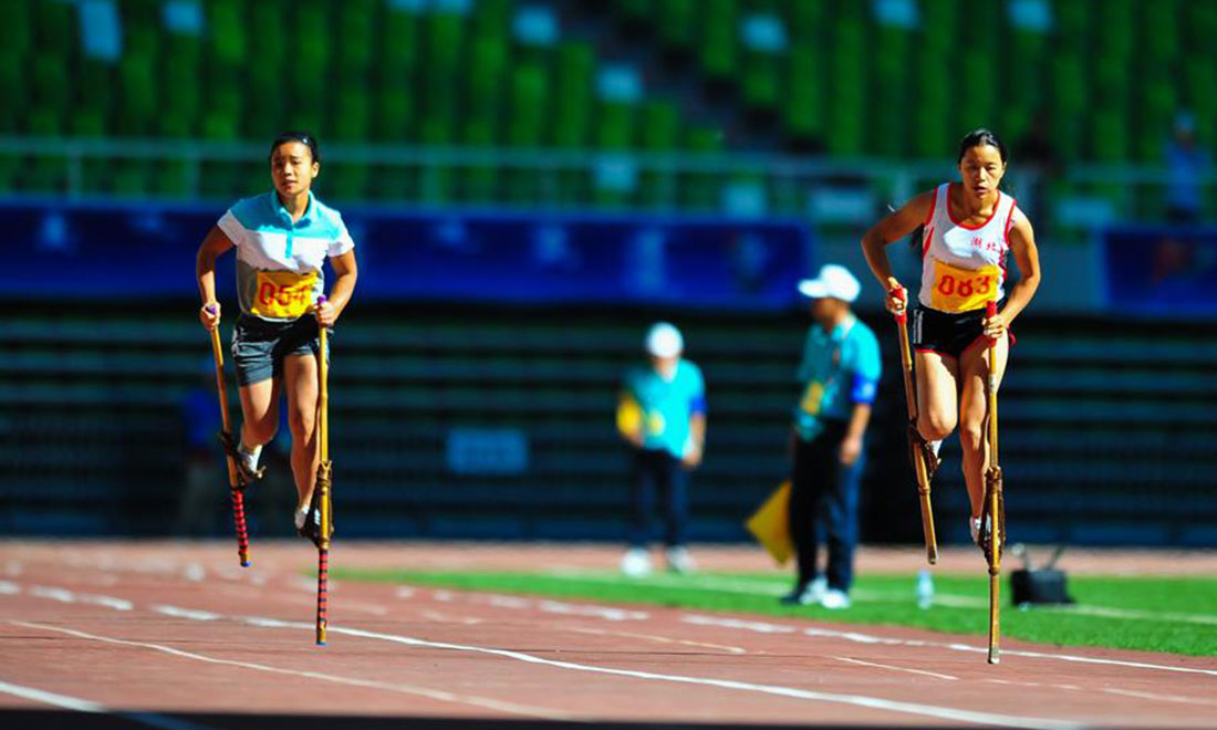Qin Yixue from the Guangxi delegation (left) and Li Yanjiao from Hubei compete in the semifinals for the 200-meter stilt race on August 15, 2015. Stilt races have been included as an event since 2003. figcaption >
