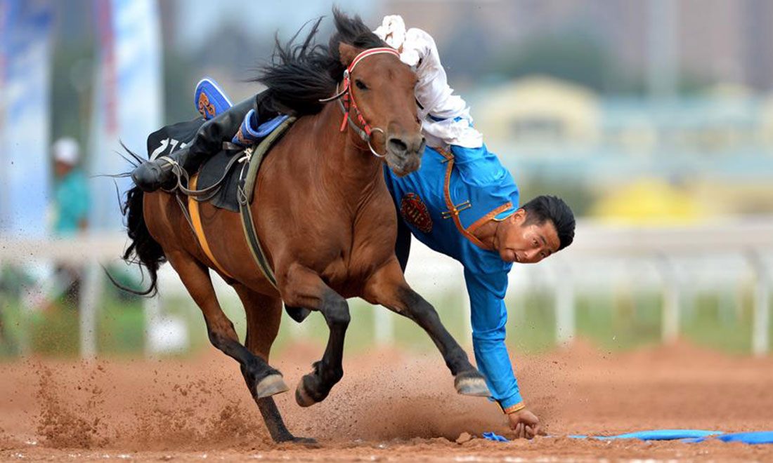 An Inner Mongolian athlete competes in an event on August 16, 2015 that requires participants to grab a hada, or ceremonial scarf, placed on the ground while atop a running horse. The sport is popular among Mongolian peoples. Contest rules require that all horses in competition must be China-bred horses and not from Arabian or British stock. figcaption >