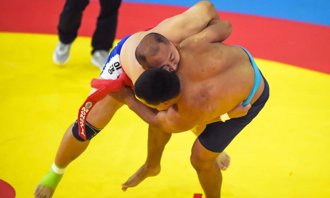 Jin Hailin from the Jilin delegation (left) grapples with a Guangdong Province contender in Korean-style wrestling, 87-kilogram weight class, on August 15, 2015. The games include six styles of wresting: Boke (Mongolian-style wrestling), Uyghur-style wrestling, Yi-style wrestling, Tibetan-style wrestling, Hui-style wrestling and Korean-style wrestling. figcaption >