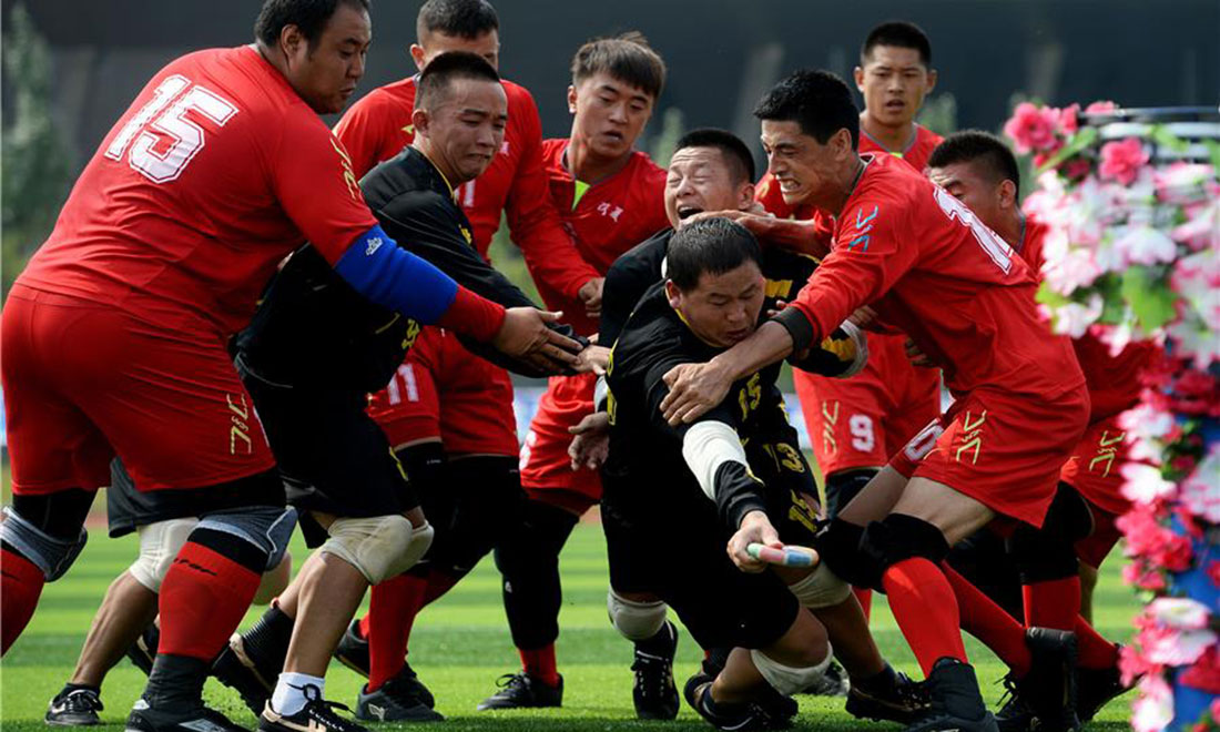 An Inner Mongolian athlete (center, in black) is tackled by opponents from the Guangxi team during a first-round huapao match on August 15. Guangxi beat Inner Mongolia 16 to 4. Huapao is popular among the Dong, Zhuang and Gelao ethnic groups. figcaption >