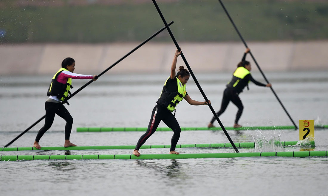 Three athletes compete in a women's 60-meters single bamboo drifting quarterfinals of on August 10, 2015. Single bamboo drifting, popular in Southwest China’s Guizhou Province, was included as a competition event in 2011. figcaption >