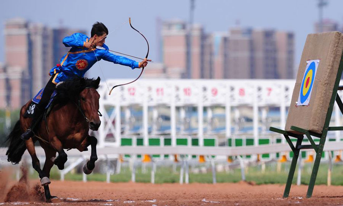 A Mongolian athlete shoots an arrow on horseback during the 10th National Traditional Games of Ethnic Minorities of China in Ordos, north China's Inner Mongolia Autonomous Region, August 12, 2015. figcaption >