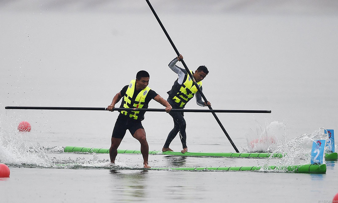 Nong Shujian from Chongqing (left) competes in the men’s 60-meter single bamboo drifting quarterfinals on August 10. Competitors stand on a 7.5-meter-long piece of bamboo and row with a thinner 4.5-meter bamboo pole. Nong won first place. figcaption >