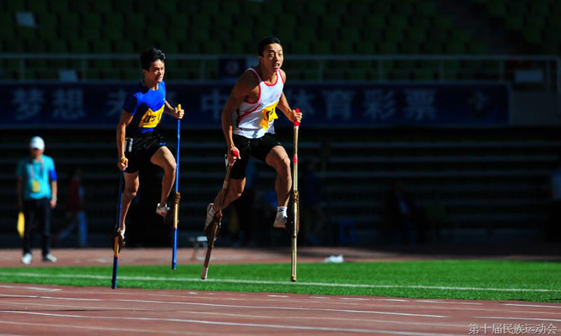 Zhou Zhenyong from Guangxi Zhuang Autonomous Region (left) and Sun Xianfeng from Hubei compete in the 200-meter stilt race competition on August 15, 2015. Originally, people of the Tujia and Miao ethnic groups use the stilt to walk in rainy days, and the Jing ethnic groups adopted it as a tool for catching fish. figcaption >