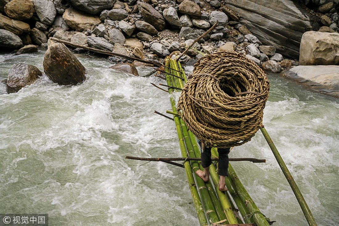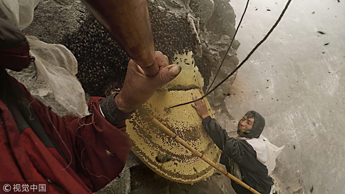 Honey hunting, an ancient tradition in Nepal, is a death-defying challenge to collect rare honey that involves climbing down cliffs as high as 150 meters with hand-woven rope ladders. The honey hunters use smoke from smoldering grass to drive away the Himalayan giant bees, whose honey fetches prices six-times greater than regular Nepali honey on Asian markets. Among its many characteristics, Himalayan giant bee honey is known for its hallucinogenic properties, according to National Geographic.