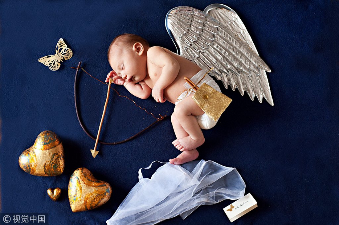 A baby dressed as Cupid shoots an arrow while asleep. British photographer Neli Prahova, also a mumtrepreneur, quit her office job to pursue her dream career in photography. Part of her job is taking photos of babies in dreamed-up scenarios. Photo: Neli Prahova/VCG figcaption >
