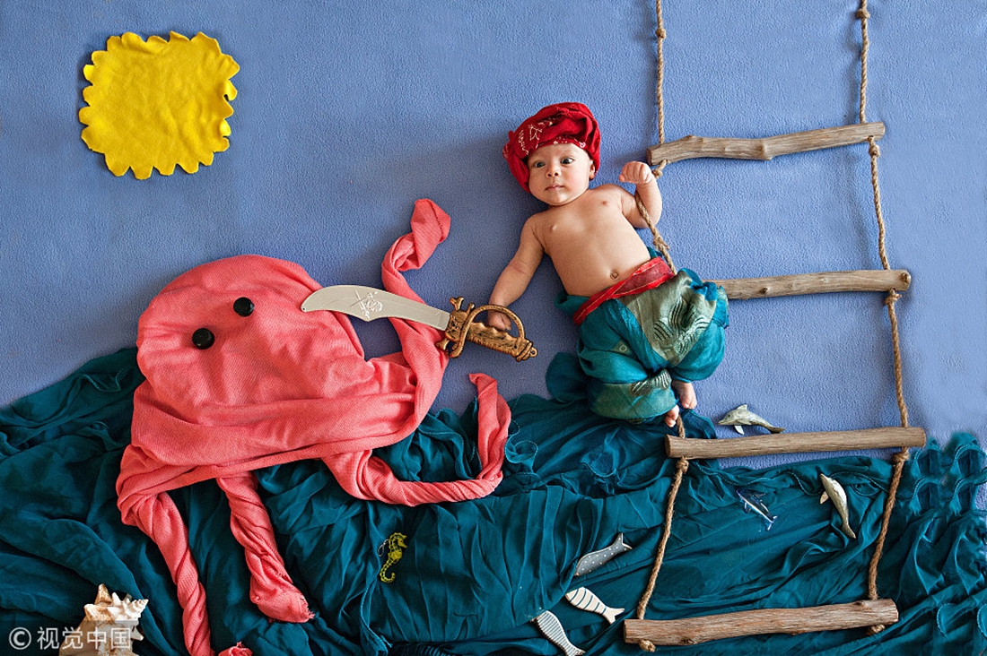 A baby dressed as Sinbad the Sailor tests his courage by fighting off an octopus. This amazing image is taken by British photographer Neli Prahova, who recreates some famous scenes from Arabian folklore with babies. Photo: Neli Prahova/VCG figcaption >