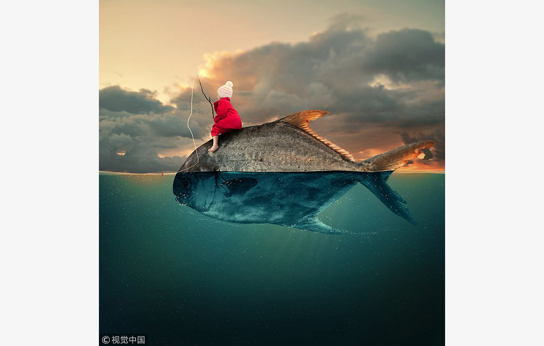 A little girl dressed in red fishes on a giant fish. Photo artist Caras Ionut uses Photoshop to digitally assemble surreal landscapes and portraits mostly using his own photography. Photo: Caras Ionut/VCG figcaption >