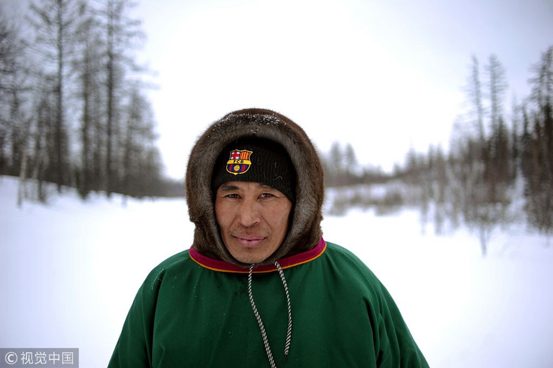 A reindeer herder pulls a reindeer while working in the remote region of Yamalo-Nenets Autonomous Okrug of northern Russia on March 8, 2018. (File photo: Sergei Gapon/VCG) figcaption >