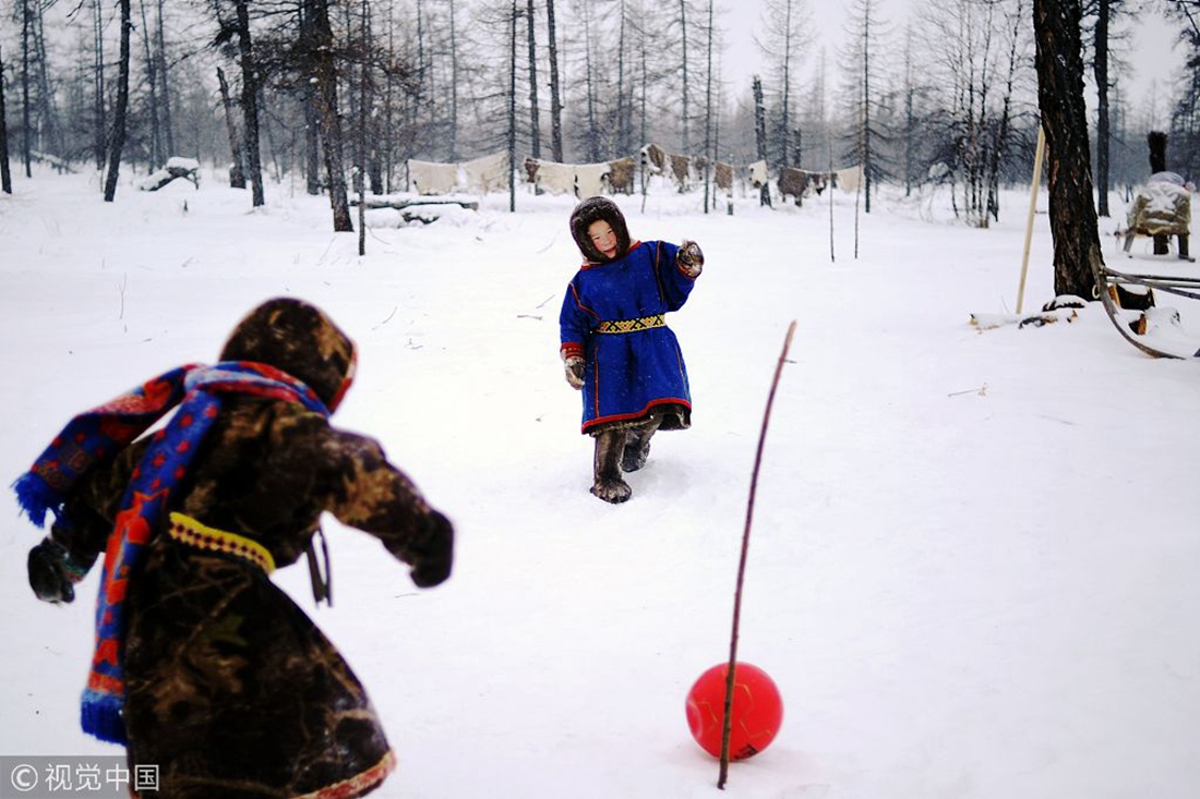 Children play with a ball in the snow in the remote region of Yamalo-Nenets Autonomous Okrug of northern Russia on March 6, 2018. (File photo: Sergei Gapon/VCG) figcaption >