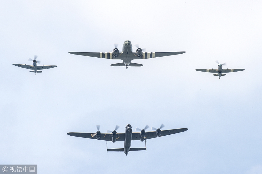 The RAF Battle of Britain Memorial Flight, consisting of a Spitfire, Hurricane, Lancaster and a Dakota, perform a flyby on June 10, 2018, over Wolverhampton, UK. (Photo: Steve Thorne/Getty Images/VCG)