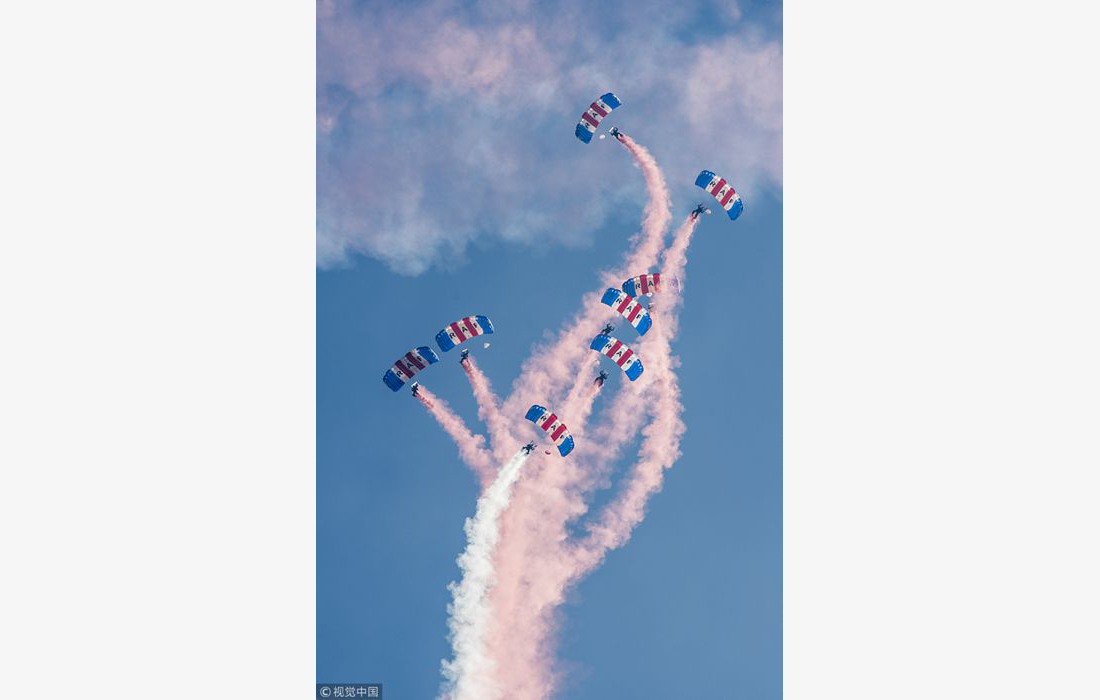The RAF Falcons, the Royal Air Force Parachute Display Team, perform on June 10, 2018, over Wolverhampton, UK. (Photo: Steve Thorne/Getty Images/VCG) figcaption >