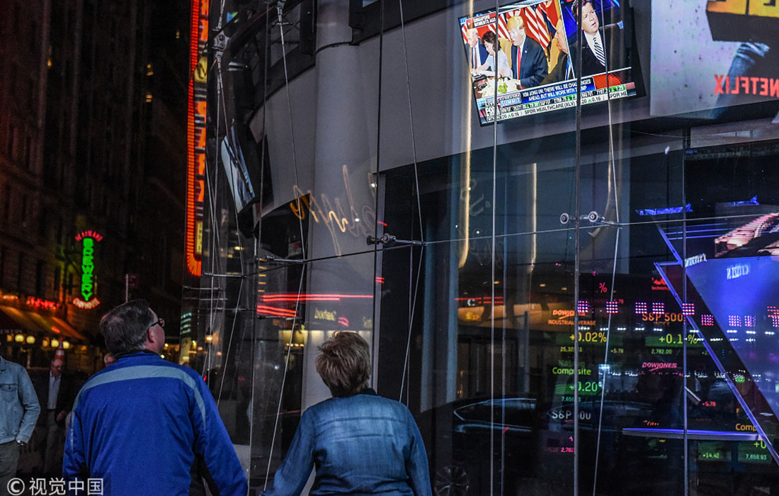 People in Times Square walk past TV screens showing the meeting between US President Donald Trump and North Korean leader Kim Jong-un on June 11, 2018 in New York City, USA. Photo: Stephanie Keith/VCG