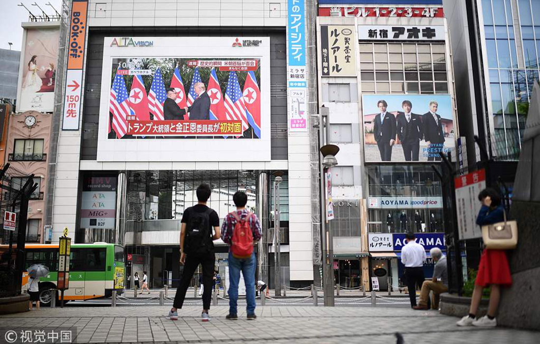 Pedestrians look at a wall-mounted screen displaying the live stream of the meeting between North Korean leader Kim Jong-un and US President Donald Trump, in Tokyo, Japan, on June 12, 2018. Photo: Martin Bureau/VCG figcaption >