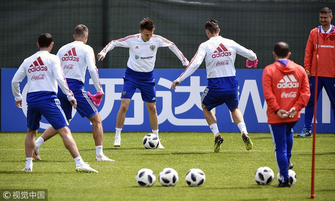 Players of the Russian national football team attend a training session in Novogorsk outside Moscow, Russia, on June 11, 2018, ahead of the 2018 World Cup in Russia. (Photo: Alexander Nemenov/VCG)