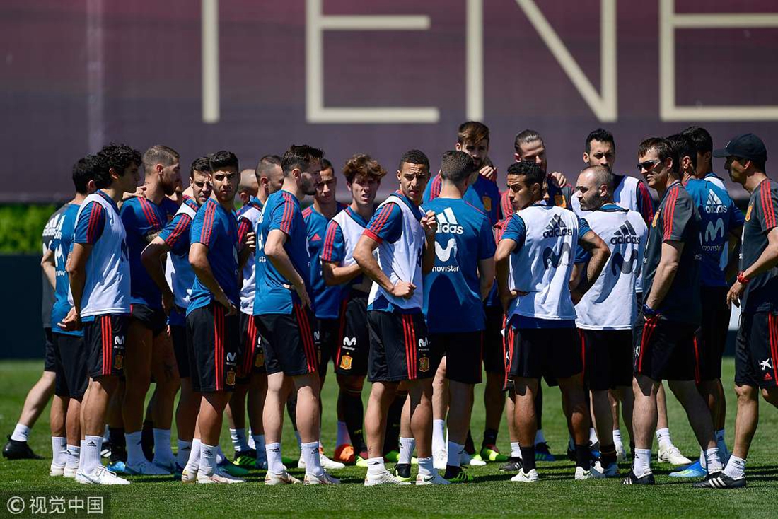 Players of Spain’s national football team attend a training session at Krasnodar Academy on June 11, 2018, ahead of the 2018 World Cup in Russia. (Photo: Pierre-Philippe Marcou /VCG) figcaption >