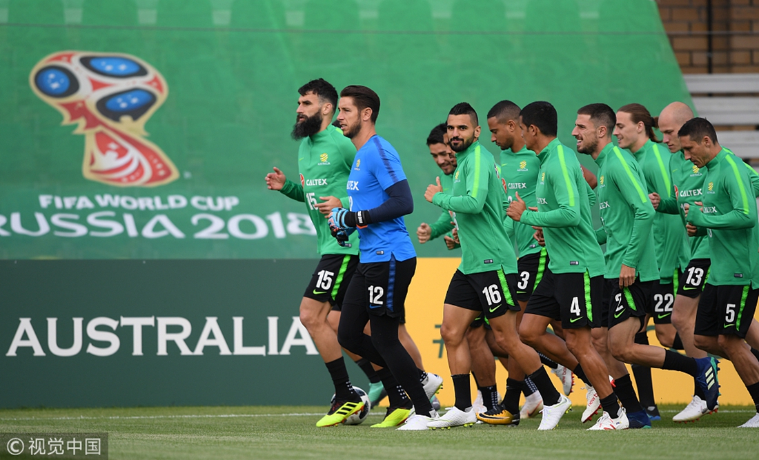 Players from the Australian national football team attend a training session ahead of the World Cup at a stadium in Kazan, Russia, on June 11, 2018. (Photo: Maksim Bogodvid/Sputnik/VCG) figcaption >