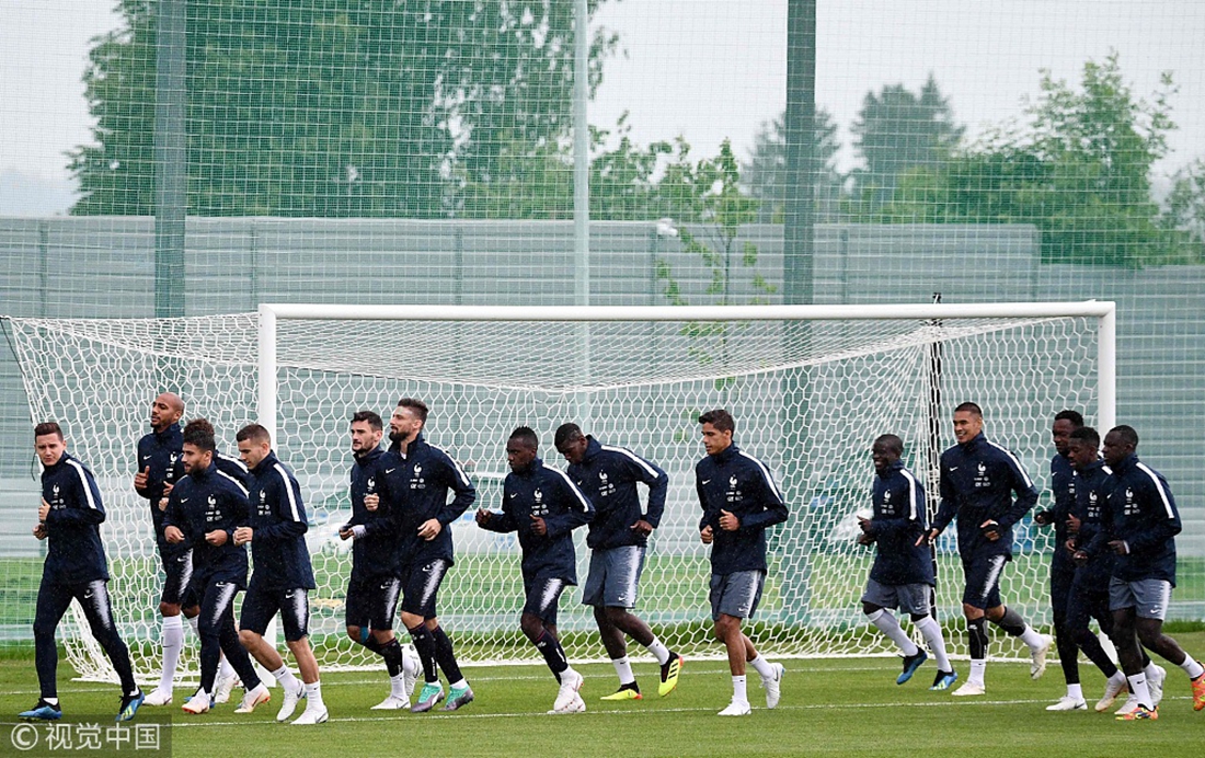 Players of the French national football team attend a training session at the Glebovets Stadium ahead of the 2018 World Cup in Russia in Istra, about 70km west of Moscow, Russia, on June 11, 2018. (Photo: Franck Fife /VCG) figcaption >