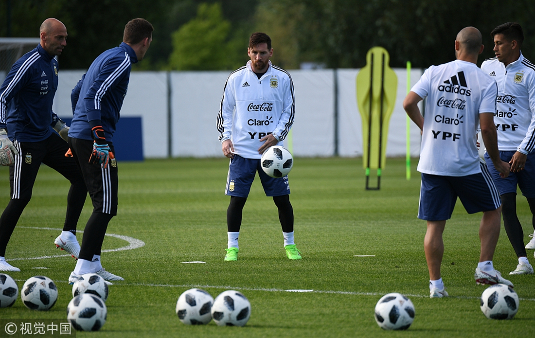 Argentina's Lionel Messi (center) practices passes with teammates ahead of the World Cup at a stadium in the town of Bronnitsy, Russia, on June 11, 2018. (Photo: Alexander Vilf/Sputnik/VCG) figcaption >