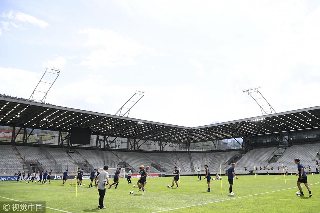 Players from the Japanese national football team participate in drills ahead of a friendly international match between Japan and Paraguay at Tivoli Stadion on June 11, 2018, in Innsbruck, Austria. (Photo: Masahiro Ura/Getty Images/VCG) figcaption >